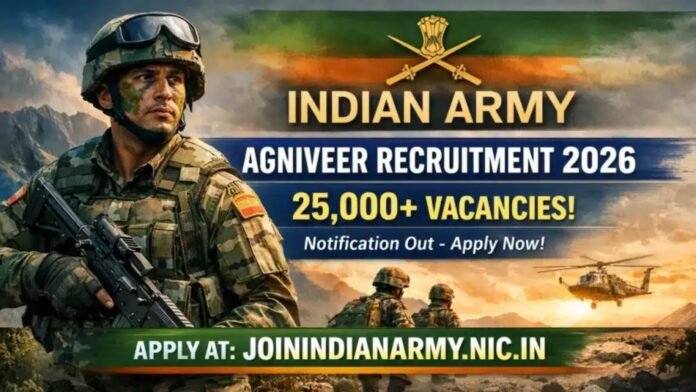 भारतीय सैन्यात भरती होऊन देशसेवा करण्याची इच्छा असलेल्या तरुणांसाठी मोठी संधी उपलब्ध झाली आहे. Indian Army ने अग्निपथ योजनेअंतर्गत Agniveer Bharti 2026 जाहीर केली आहे. या भरती प्रक्रियेद्वारे देशभरात 25,000 पेक्षा जास्त पदे भरली जाणार आहेत.